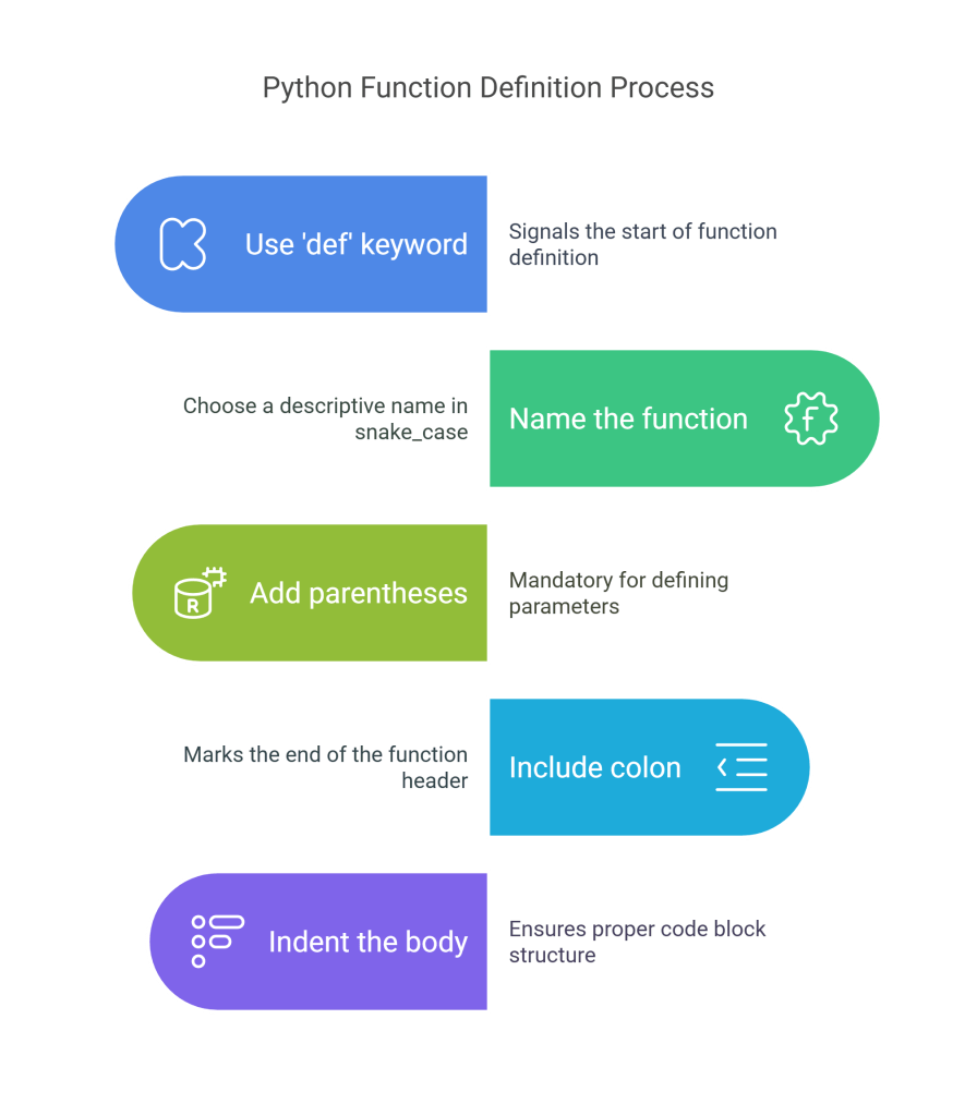 defkeyword: This signals to Python that you are defining a function. It’s short for “define”.my_first_function: This is the name of the function. Function names should be lowercase, with words separated by underscores (snake_case), following Python’s standard style guide, PEP 8. Choose names that are descriptive and indicate the action the function performs. For example,calculate_total,process_data,format_string. Avoid generic names likefunc1,process, orhandler.()(Parentheses): These are mandatory, even if your function doesn’t accept any input data. They are where you define the function’s parameters, which we’ll cover next.:(Colon): This marks the end of the function header and signifies that the indented block of code that follows is the function’s body.- Indentation: All statements belonging to the function’s body must be indented by the same amount (the standard is 4 spaces). This is how Python groups statements together and defines the boundaries of code blocks, including function bodies. Unlike languages like C++ or Java that use curly braces