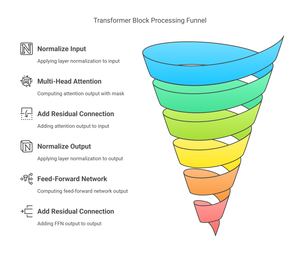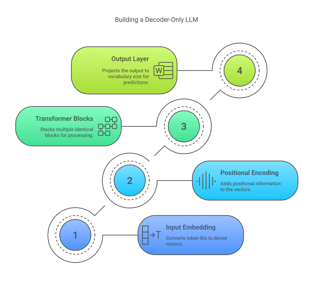 We have journeyed through the core components: starting with tokenization to convert text into manageable units, followed by embedding layers that map these units into meaningful vector spaces. The introduction of positional encoding addresses the Transformer’s inherent lack of sequence awareness. The engine of the LLM is the stack of Transformer blocks, each employing multi-head self-attention to weigh the importance of different tokens and a position-wise feed-forward network to process information locally. Crucial elements like residual connections and layer normalization ensure stable training of these deep networks.