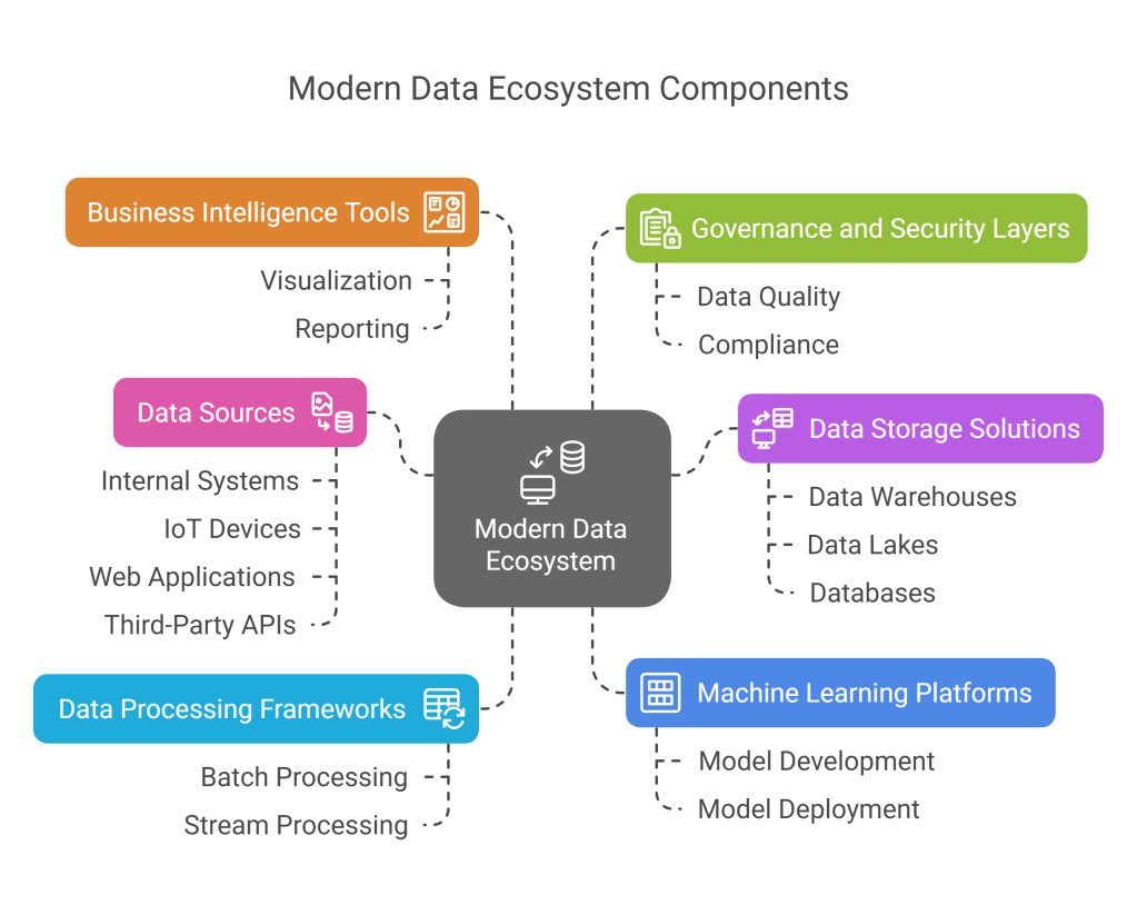 - Data sources: Internal systems, IoT devices, web applications, third-party APIs