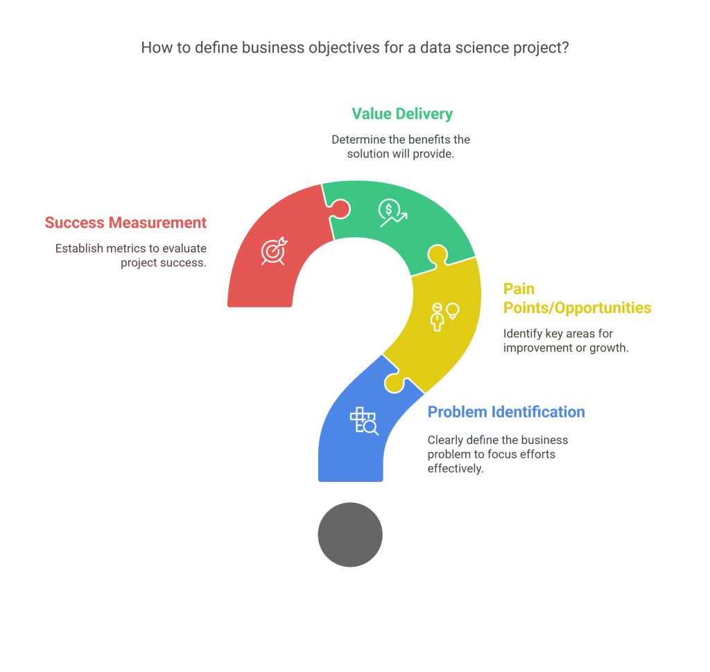 Every successful data science project begins with clearly articulated business objectives. These objectives should address the following questions: