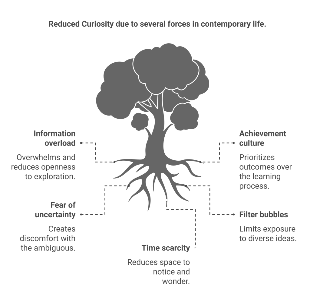 Before exploring how to cultivate curiosity, it’s worth examining what stands in its way. Despite our natural capacity for wonder, several forces in contemporary life can dampen our curiosity: