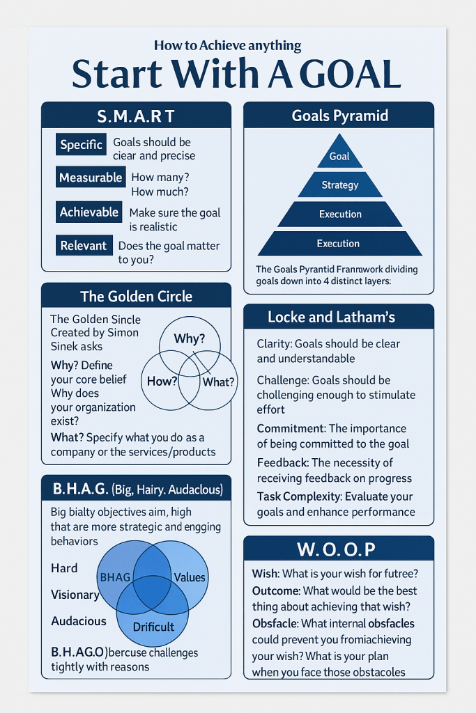 From the foundational clarity and measurability of S.M.A.R.T. goals, which provide the tactical precision for daily action, to the profound purpose articulated by The Golden Circle, which imbues every effort with meaning, these methodologies serve as indispensable tools. The Goals Pyramid offers a hierarchical roadmap, breaking down grand visions into manageable steps, while Locke and Latham’s principles optimize human performance by focusing on goal characteristics that drive motivation and commitment. For those daring to dream big, B.H.A.G.s provide the audacious, long-term vision that inspires transformative change. And finally, W.O.O.P. equips individuals with the psychological resilience to confront and overcome the inevitable internal obstacles that arise on any path to success.