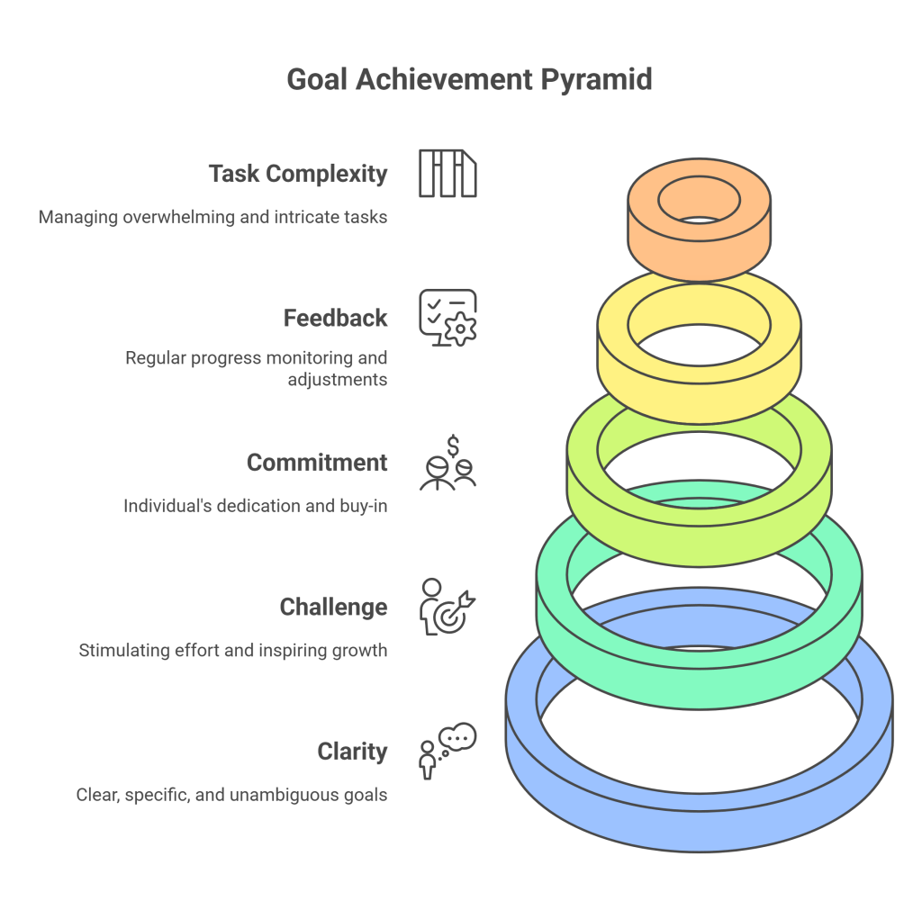 To ensure that individuals and teams are performing at their peak while pursuing these structured goals, Locke and Latham’s 5 Principles come into play. As S.M.A.R.T. goals are set and tasks are assigned within the Goals Pyramid, ensure they embody: