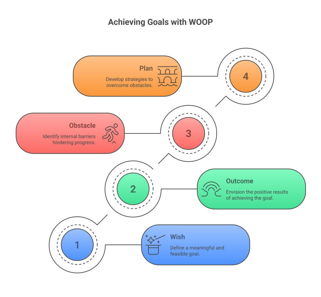- Prepare for Obstacles (W.O.O.P.): Proactively identify internal barriers and create “if-then” plans to overcome them.