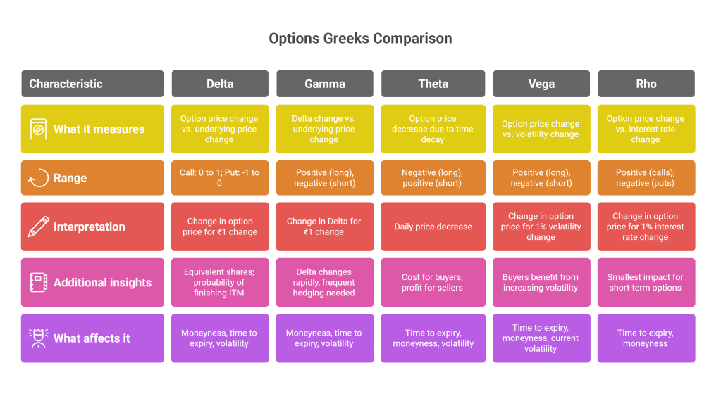 - Delta of 0.50 for a call: If the underlying price increases by ₹1, the option price increases by ₹0.50