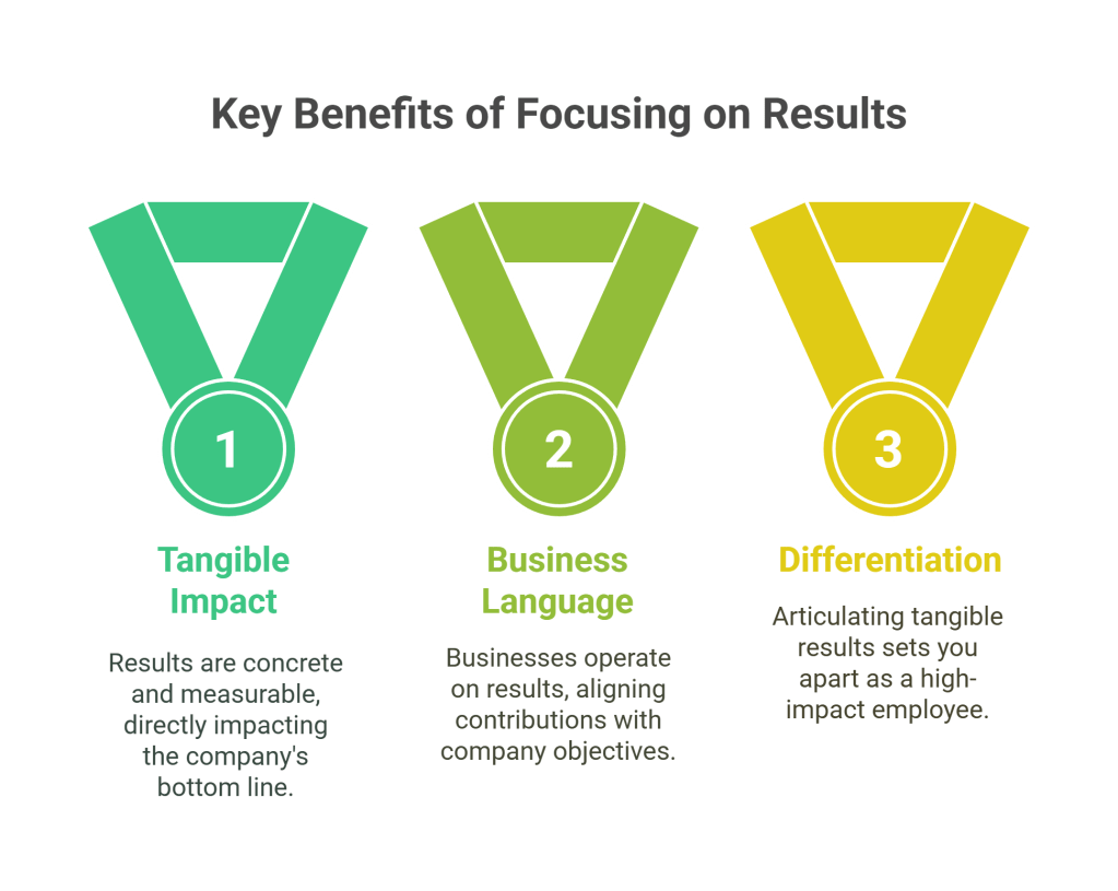 - Differentiation: Many people put in effort. Fewer can clearly articulate the tangible results of that effort. Focusing on outcomes differentiates you as a high-impact employee.