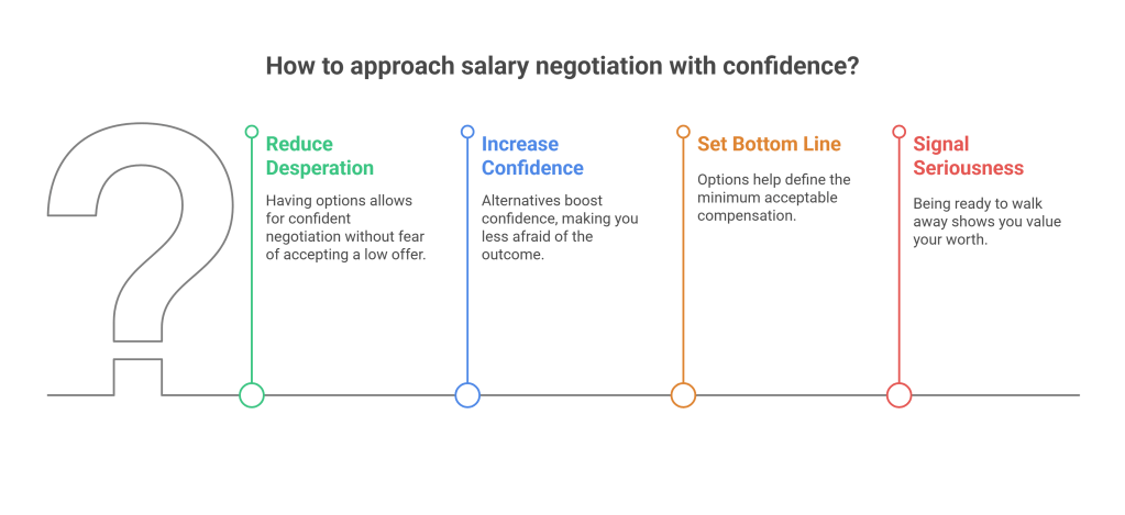 - Reduces Desperation: When you have other options, you are not negotiating from a position of desperation. This allows you to be more confident and less likely to accept an offer that is significantly below your worth.