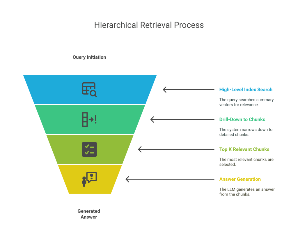 - Improved Relevance: By first identifying broad relevant topics, the subsequent granular search is more likely to yield highly relevant chunks, as irrelevant sections are pruned early.