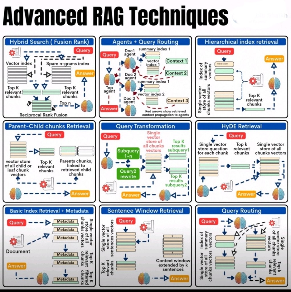 From the robust combination of lexical and semantic signals in Hybrid Search to the precise contextual expansion of Sentence Window Retrieval, each technique addresses specific challenges inherent in real-world information retrieval. Agents + Query Routing and Hierarchical Index Retrieval provide scalable solutions for managing vast and diverse knowledge bases, ensuring efficiency and specialization. Parent-Child Chunks Retrieval elegantly balances retrieval precision with comprehensive context, while Query Transformation and HyDE Retrieval proactively enhance query quality to bridge the gap between user intent and document content. Finally, integrating Metadata allows for fine-grained control and filtering, adding a layer of factual and conditional accuracy.