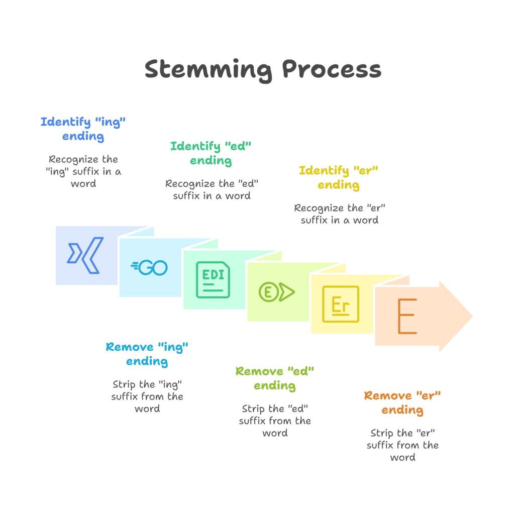 Stemming is a rule-based process that removes suffixes from words to reduce them to their root form, called a “stem.” Think of it as a crude but fast method of chopping off word endings based on predefined rules. The stem doesn’t necessarily have to be a valid word in the language—it’s simply the remaining portion after the suffix removal process.
