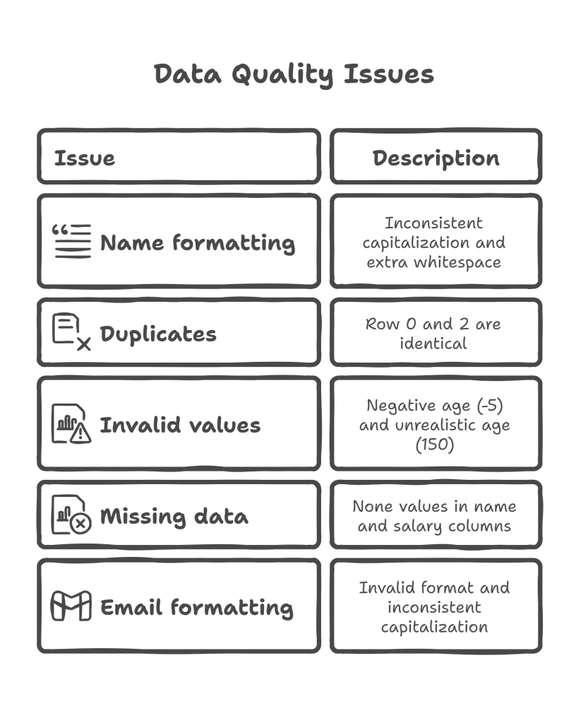 - Business rules: Age must be realistic, email must have proper format, salary has reasonable bounds