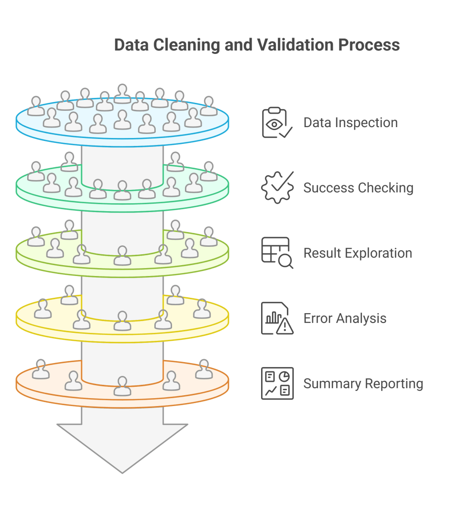 - Result exploration: Systematically examine cleaned data, errors, and processing statistics