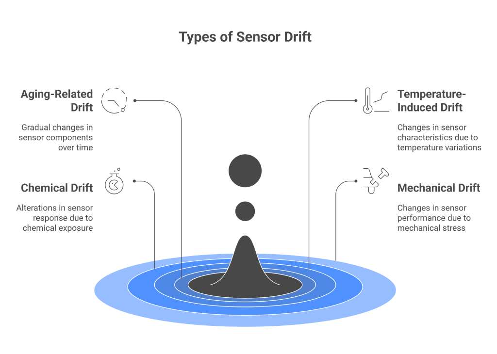 Mechanical Drift affects sensors with moving parts or those subject to mechanical stress. Over time, mechanical components may wear, settle, or deform, leading to changes in sensor response. This type of drift is common in pressure sensors, accelerometers, and other mechanically-based sensing devices.