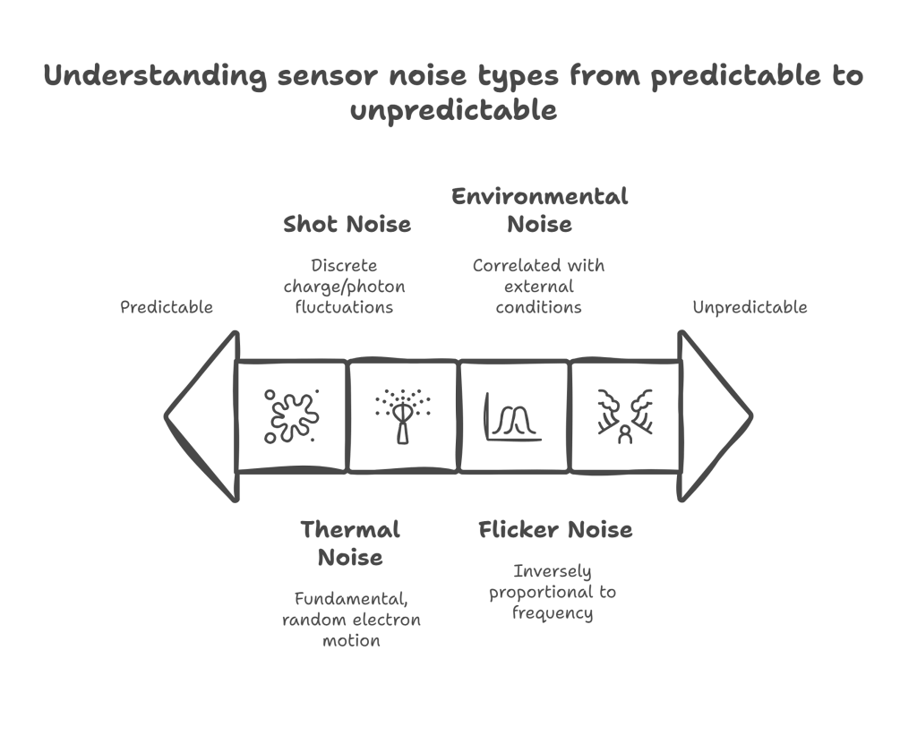 Environmental Noise encompasses all external factors that can influence sensor readings. This includes electromagnetic interference from nearby electronic devices, mechanical vibrations, temperature fluctuations, humidity changes, and other environmental variables that can affect sensor performance. Unlike the previously mentioned noise types, environmental noise is often correlated with external conditions and may exhibit patterns that can potentially be modeled or compensated for.