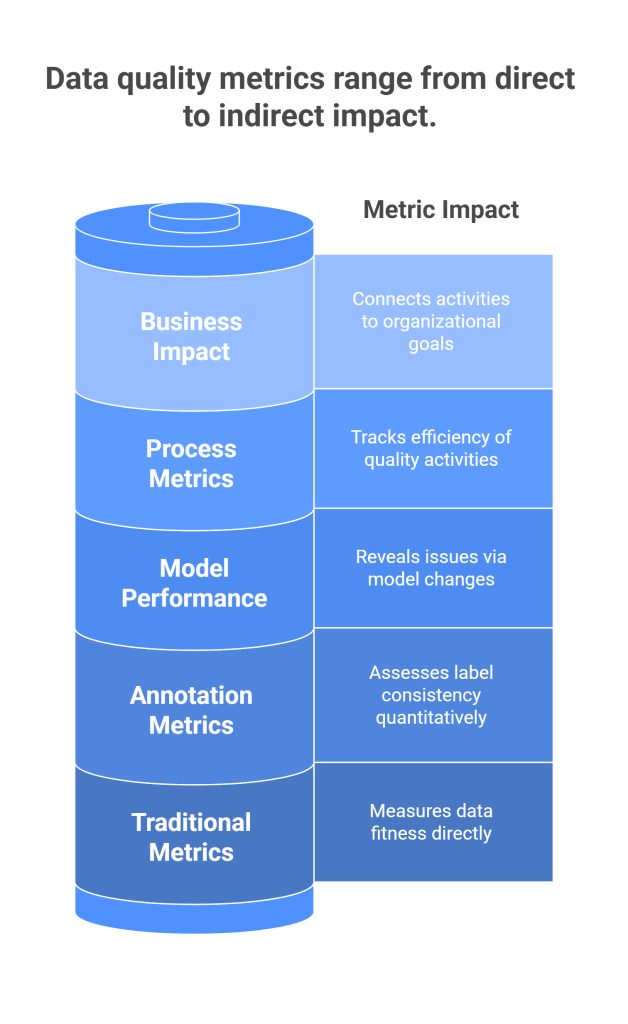 Model performance metrics provide indirect but important measures of data and annotation quality. Changes in model accuracy, precision, recall, and other performance indicators can reveal quality issues that might not be apparent from direct data assessment. However, model performance is influenced by many factors beyond data quality, so these metrics must be interpreted in context.