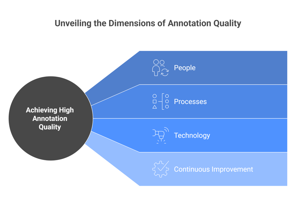 Achieving high annotation quality requires a comprehensive approach that addresses people, processes, and technology. The most effective annotation quality strategies recognize that annotation is both a technical and human endeavor that requires careful attention to cognitive, social, and organizational factors.