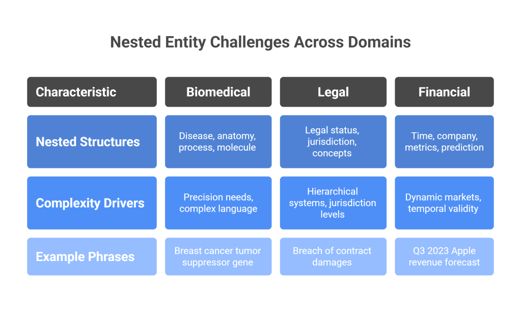 The biomedical domain presents particularly complex nested entity challenges. Medical texts frequently contain nested structures like “breast cancer tumor suppressor gene,” where disease (“breast cancer”), anatomy (“tumor”), biological process (“suppressor”), and molecular entity (“gene”) categories all overlap. The precision required in medical applications makes annotation errors particularly costly, yet the complexity of biomedical language makes perfect annotation extremely difficult.