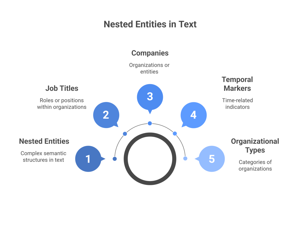 The complexity of nested entities manifests in several distinct patterns. Hierarchical nesting occurs when entities exist at different levels of granularity, such as “New York City Mayor” where “New York City” is a location and “Mayor” is a political position, but together they form a specific governmental role. Overlapping entities present another challenge, as seen in “Apple iPhone sales” where “Apple” is a company, “iPhone” is a product, and “Apple iPhone” together represents a specific product line.