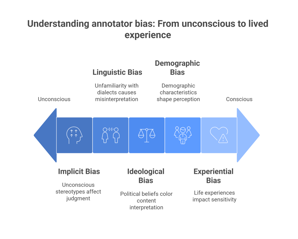 - Implicit Bias: These are the unconscious associations and stereotypes that everyone holds. Implicit biases can lead annotators to make snap judgments about content based on keywords or phrases, without fully considering the context. For example, the mere presence of an identity term, such as “Black” or “gay,” can trigger an implicit bias that leads an annotator to be more likely to label a comment as toxic, even if the comment itself is not hateful.
