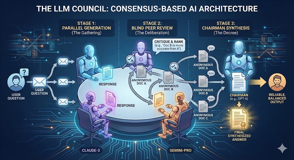 - Hallucination Check: If Model A hallucinates a fact, Model B and C will likely catch it in Stage 2 (“Response A claims X, but this is incorrect because…”).